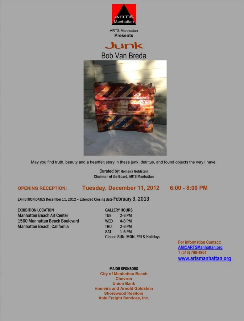 BOB VAN BREDA: JUNK December 11, 2012 – February 3, 2012 View fullsize TIME4ARTHomeira GoldsteinDecember 11, 2012ARTS MANHATTAN, Bob Van Breda Facebook0 Twitter Pinterest0 0 Likes