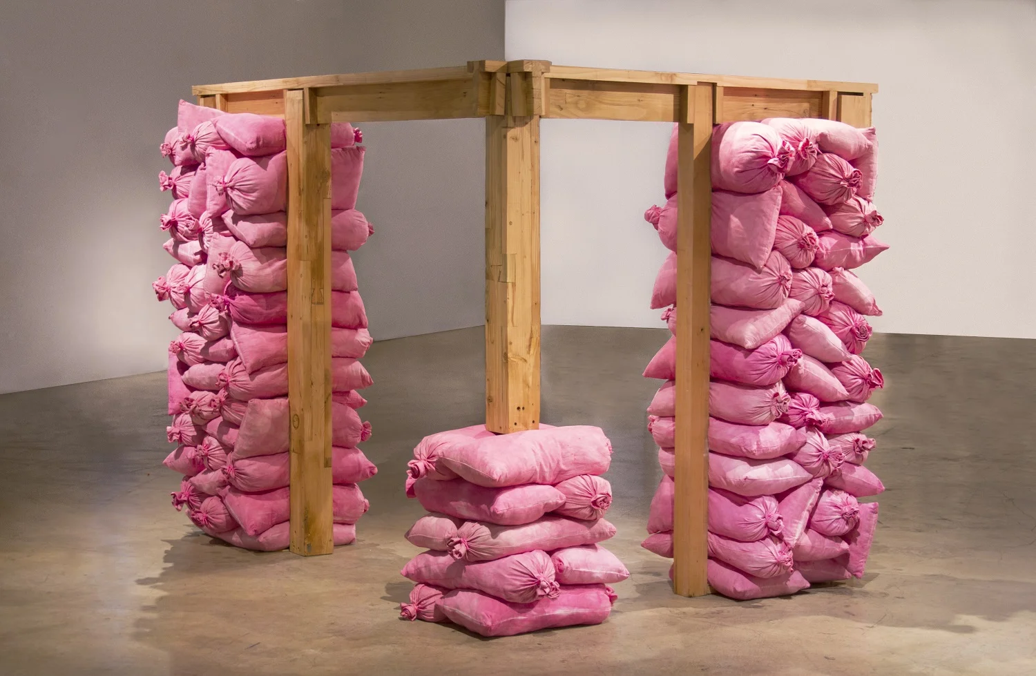 Gilbert’s work involves the labor-intensive process of hand sewing and hand-dyeing hundreds of visually dense canvas objects that weigh upon or support fragile wood structures that remind us of relief carvings, elaborately designed doors, buttresses, architectural joints and bridges. Two site-specific works will be built directly into the architecture of intentionally destroyed gallery walls.