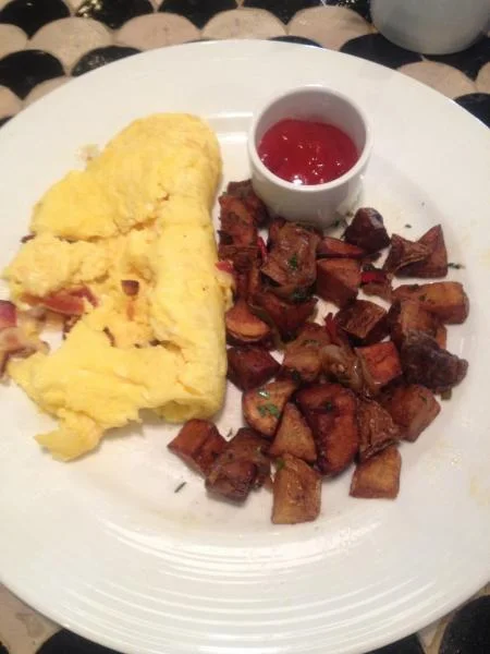 After a long wait our food showed up. My husband and I looked at each other with a big disappointment. He could have played Frisbee with his omelet and I could have used my scrambled eggs as grout. He tried to get into the omelet and see if the inside is softer with the melted cheese and bacon with no luck. I could barely swallow my eggs from dryness. I don’t even have to comment on the visual aspect of the dish. They tried to make a second attempt but were futile. How could a chef not know how to make omelets and scrambled eggs?