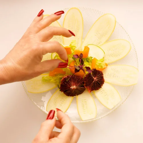 To complete your cooking experience and creation, select plates that showcase your food then visually arrange and present them artfully.